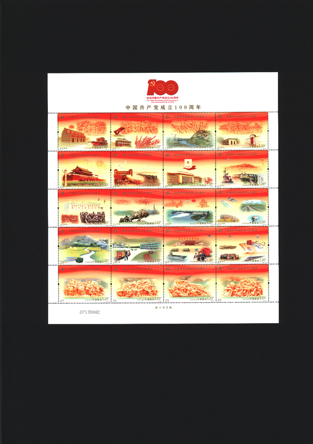 《建党100周年》30元邮折,版票流水号:0713888C