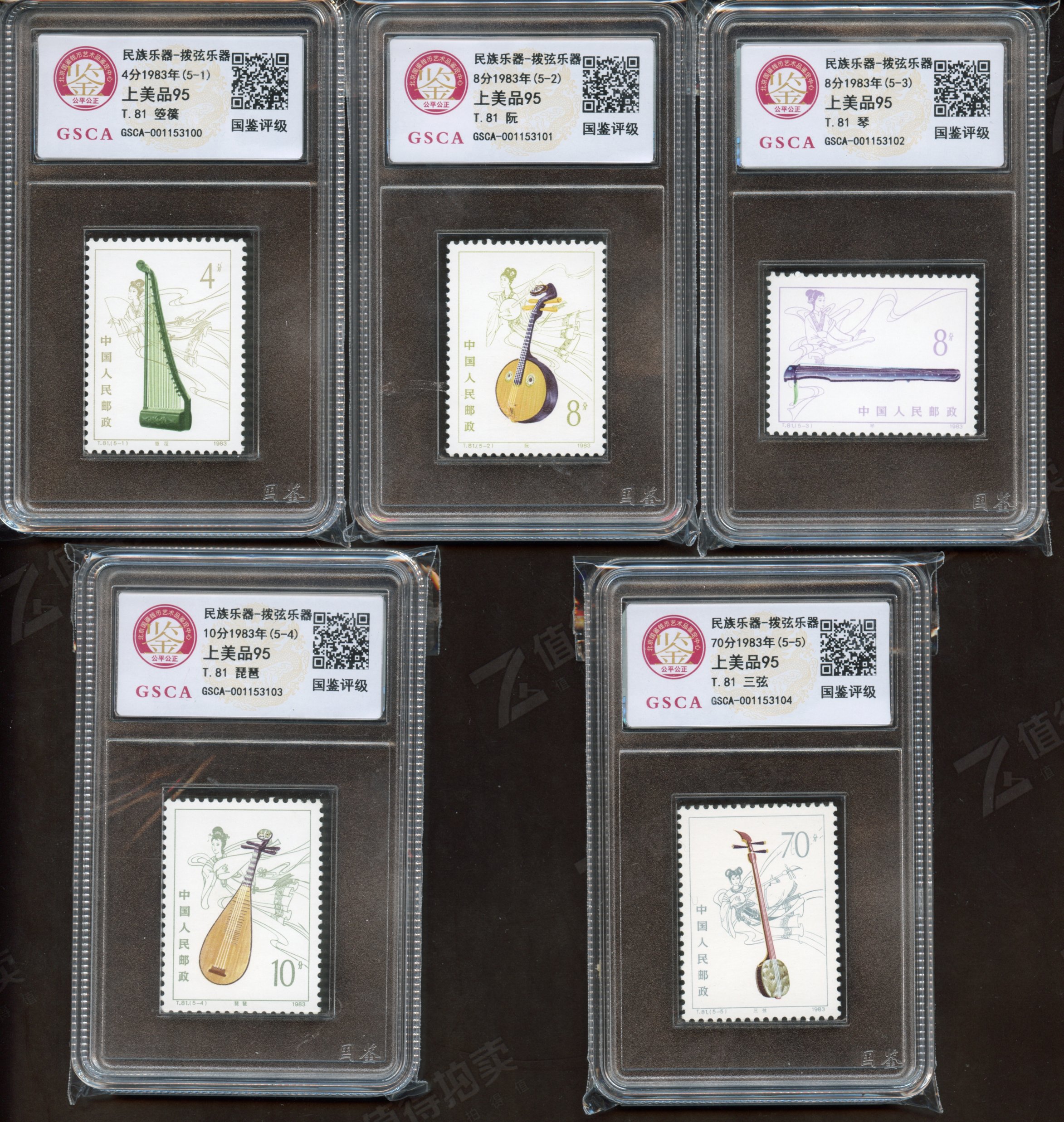 T81 民族乐器套票 国鉴评级上美品95 (5-1)流水号:001153100 (5-2)流水号:001153101 (5-3)流水号:001153102 (5-4)流水号:001153103 (5-5)流水号:001153104