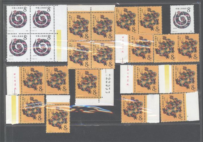 一轮龙(18套):带边4方连1个(潮斑),双连1个,套票12个(3个带边,3个厂铭,2个色标,1个数字直角边,普通3个) 一轮蛇(5套):色标4方连1个,套票1套