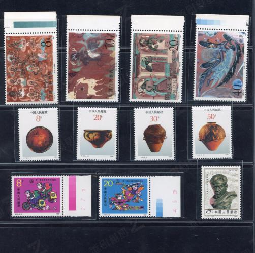 J111 冼星海套票 J154 第一届农民运动会套票 T116 壁画一组套票 T149 彩陶套票 均受潮