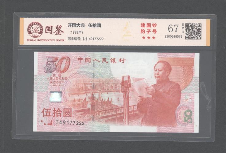 建国钞(222豹子号)国鉴三星67E,冠号:J49177222